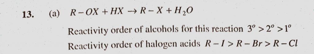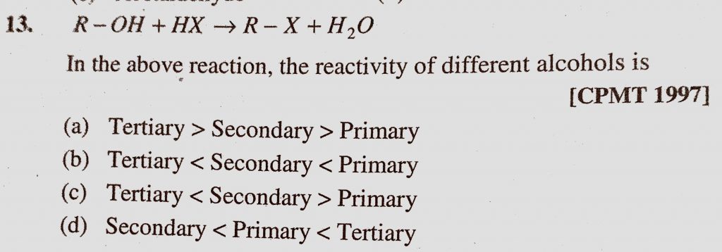 R-OH + HX to R – X + H2O In the above reaction, the reactivity of different alcohols is (a) Tertiary > Secondary > Primary (b) Tertiary < Secondary < Primary R-OH + HX to R - X + H2O In the above reaction the reactivity of different alcohols is (a) Tertiary > Secondary > Primary (b) Tertiary < Secondary < Primary December 17, 2020 Category: Uncategorised (JEE Advanced Physics by BM Sharma + GMP Solutions) , Facebook Messenger WhatsApp Share this:TwitterFacebook Related