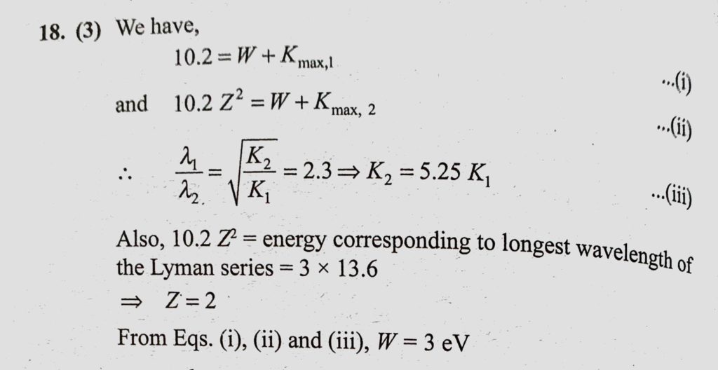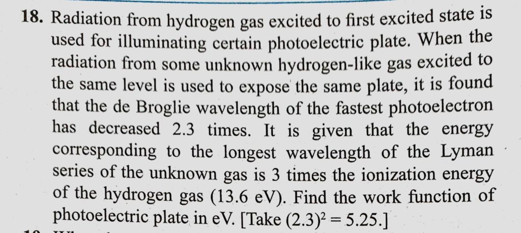 Radiation from hydrogen gas excited to first excited state is used for illuminating certain photoelectric plate. When the radiation from some unknown hydrogen-like gas excited to the same level is used Find the quantum number 'n' corresponding to exciting state of He+ ion if on transition to the ground state that ion emits two photons in succession with wavelength 1026.7 A and 304 A. October 16, 2020 Category: Uncategorised (JEE Advanced Physics by BM Sharma + GMP Solutions) , Facebook Messenger WhatsApp Share this:TwitterFacebook Related