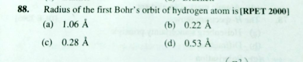 Radius of the first Bohr’s orbit of hydrogen atom is (a) 1.06 A (b) 0.22 A (c) 0.28 A (d) 0.53 A Radius of the first Bohr's orbit of hydrogen atom is (a) 1.06 A (b) 0.22 A (c) 0.28 A (d) 0.53 A November 27, 2020 Category: Uncategorised (JEE Advanced Physics by BM Sharma + GMP Solutions) , Facebook Messenger WhatsApp Share this:TwitterFacebook Related