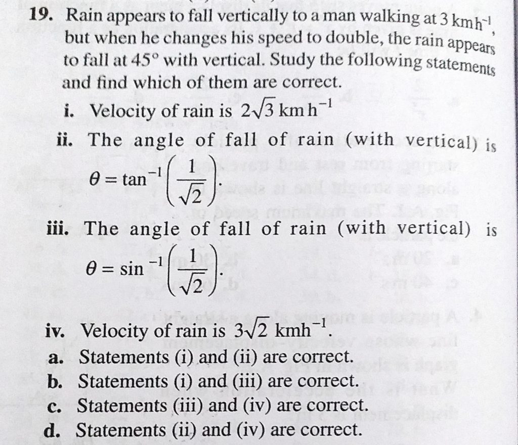 Rain appears to fall vertically to a man walking at 3 km/h, but when he changes his speed to double, the rain appears to fall at 45 with vertical. Study the following statements and find which of them are correct. but when he changes his speed to double Rain appears to fall vertically to a man walking at 3 km/h the rain appears to fall at 45 with vertical. Study the following statements and find which of them are correct. September 24, 2020 Category: Uncategorised (JEE Advanced Physics by BM Sharma + GMP Solutions) , Facebook Messenger WhatsApp Share this:TwitterFacebook Related