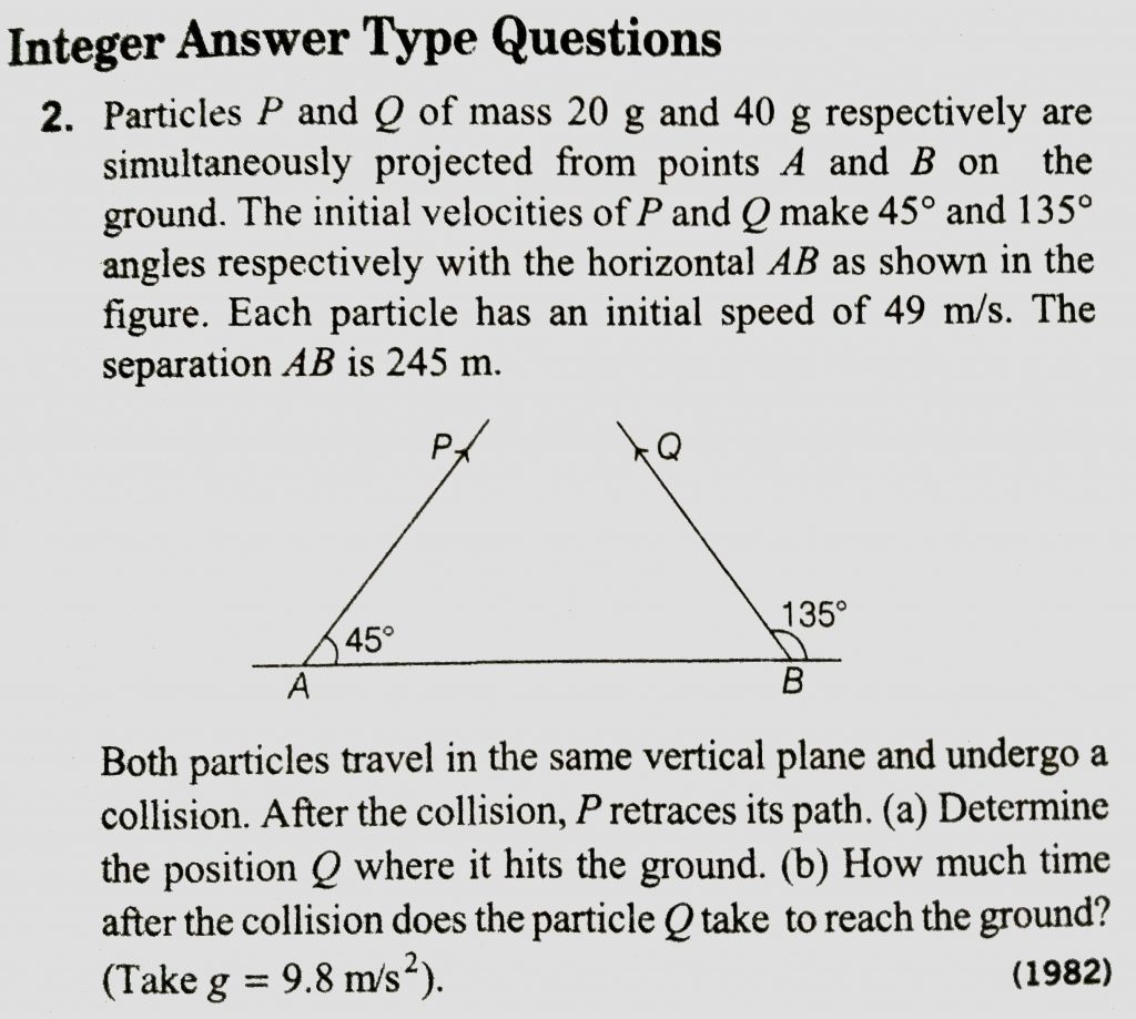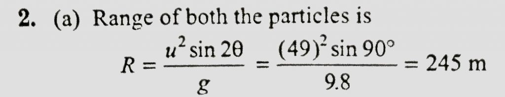 Range of both the particles is R = u^2 sin 2 thita /g = (49)^2 sin 90 degree/9.8 =245 m Range of both the particles is R = u^2 sin 2 thita /g = (49)^2 sin 90 degree/9.8 =245 m February 13, 2021 Category: Uncategorised (JEE Advanced Physics by BM Sharma + GMP Solutions) , Facebook Messenger WhatsApp Share this:TwitterFacebook Related