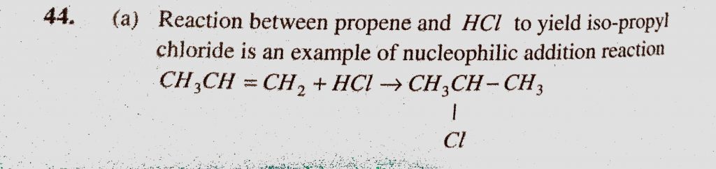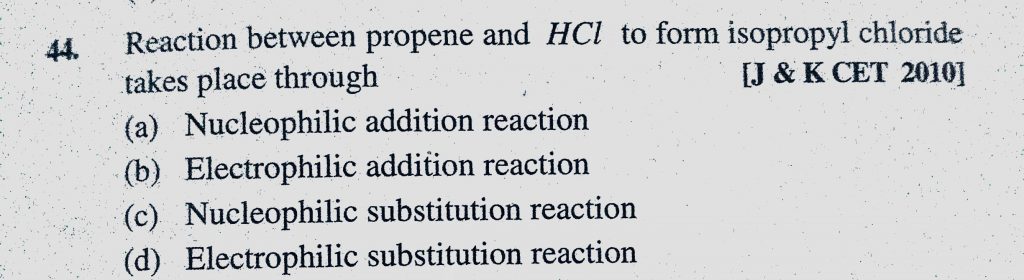 Reaction between propene and HCl to form isopropyl chloride takes place through (a) Nucleophilic addition reaction (b) Electrophilic addition reaction Reaction between propene and HCl to form isopropyl chloride takes place through (a) Nucleophilic addition reaction (b) Electrophilic addition reaction December 9, 2020 Category: Uncategorised (JEE Advanced Physics by BM Sharma + GMP Solutions) , Facebook Messenger WhatsApp Share this:TwitterFacebook Related