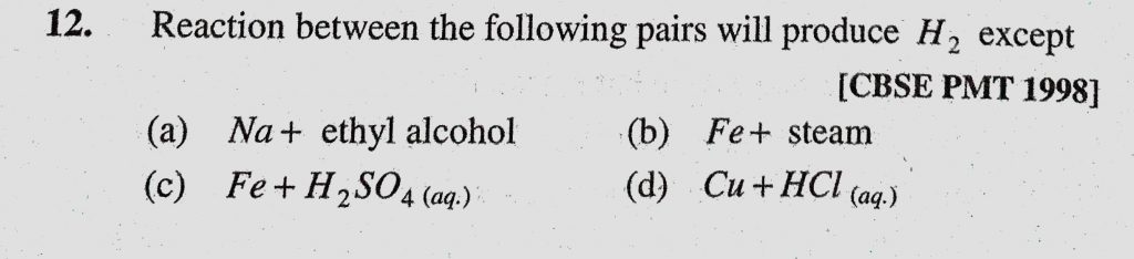 Reaction between the following pairs will produce H2 except (a) Na + ethyl alcohol (b) Fe + steam (c) Fe + H2SO4 Reaction between the following pairs will produce H2 except (a) Na + ethyl alcohol (b) Fe + steam (c) Fe + H2SO4 November 30, 2020 Category: Uncategorised (JEE Advanced Physics by BM Sharma + GMP Solutions) , Facebook Messenger WhatsApp Share this:TwitterFacebook Related