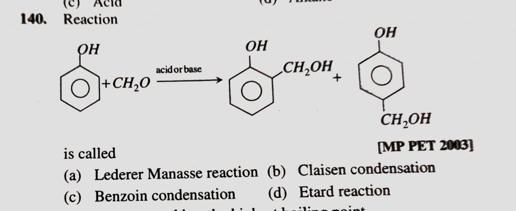 Reaction is called (a) Lederer manasse reaction (b) Claisen condensation (c) Benzoin condensation (d) Etard reaction Reaction is called (a) Lederer manasse reaction (b) Claisen condensation (c) Benzoin condensation (d) Etard reaction February 14, 2021 Category: Uncategorised (JEE Advanced Physics by BM Sharma + GMP Solutions) , Facebook Messenger WhatsApp Share this:TwitterFacebook Related