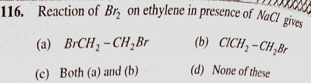 Reaction of Br2 on ethylene in presence of NaCl gives (a) BrCH2-CH2Br (b) ClCH2-CH2Br (c) Both (a) and (b) (d) None of these Reaction of Br2 on ethylene in presence of NaCl gives (a) BrCH2-CH2Br (b) ClCH2-CH2Br (c) Both (a) and (b) (d) None of these December 14, 2020 Category: Uncategorised (JEE Advanced Physics by BM Sharma + GMP Solutions) , Facebook Messenger WhatsApp Share this:TwitterFacebook Related