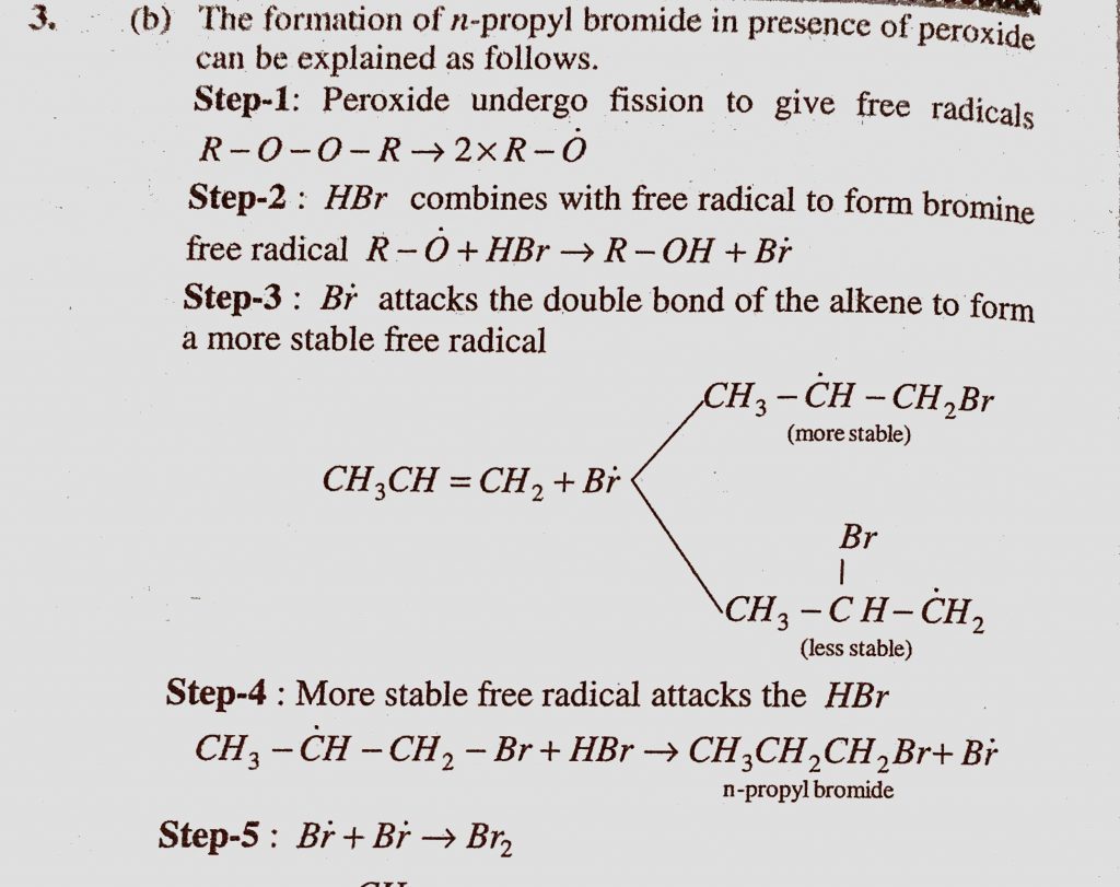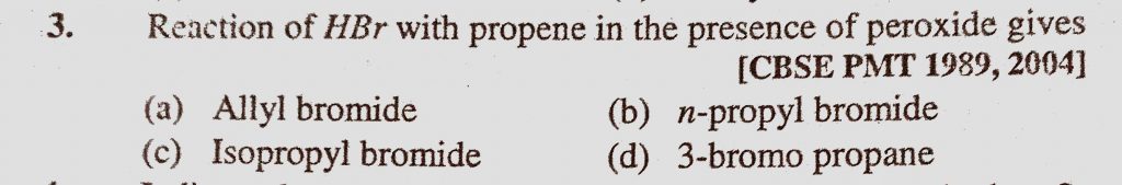 Reaction of HBr with propene in the presence of peroxide gives (a) Allyl bromide (b) n-propyl bromide (c) Isopropyl bromide (d) 3-bromo propane Reaction of HBr with propene in the presence of peroxide gives (a) Allyl bromide (b) n-propyl bromide (c) Isopropyl bromide (d) 3-bromo propane December 13, 2020 Category: Uncategorised (JEE Advanced Physics by BM Sharma + GMP Solutions) , Facebook Messenger WhatsApp Share this:TwitterFacebook Related