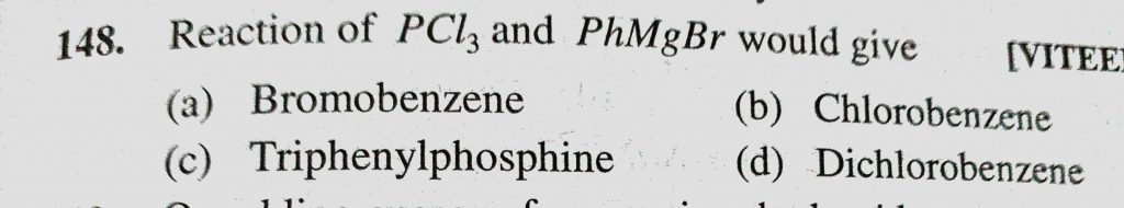 Reaction of PCl3 and PhMgBr would give (a) Bromobenzene (b) Chlorobenzene (c) Triphenylphosphine (d) Dichlorobenzene Reaction of PCl3 and PhMgBr would give (a) Bromobenzene (b) Chlorobenzene (c) Triphenylphosphine (d) Dichlorobenzene November 23, 2020 Category: Uncategorised (JEE Advanced Physics by BM Sharma + GMP Solutions) , Facebook Messenger WhatsApp Share this:TwitterFacebook Related