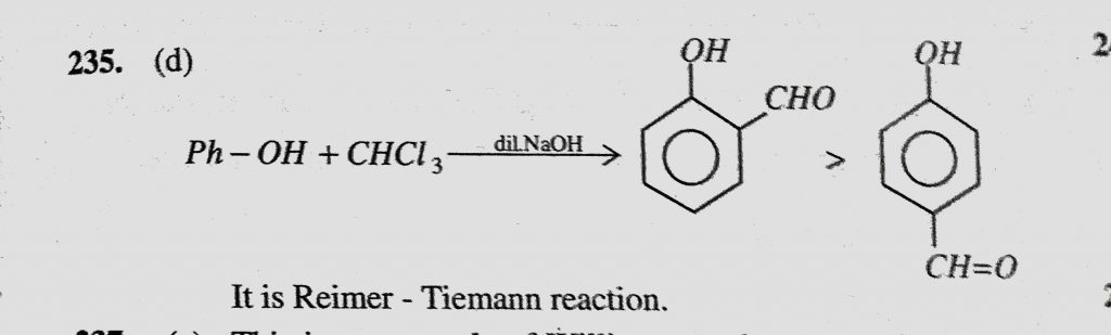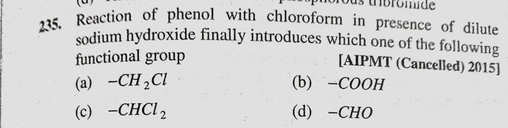 Reaction of phenol with chloroform in presence of dilute sodium hydroxide finally introduces which one of the following functional group (a) -CH2Cl (b) -COOH (c) -CHCl2 (d) -CHO Reaction of phenol with chloroform in presence of dilute sodium hydroxide finally introduces which one of the following functional group (a) -CH2Cl (b) -COOH (c) -CHCl2 (d) -CHO February 11, 2021 Category: Uncategorised (JEE Advanced Physics by BM Sharma + GMP Solutions) , Facebook Messenger WhatsApp Share this:TwitterFacebook Related