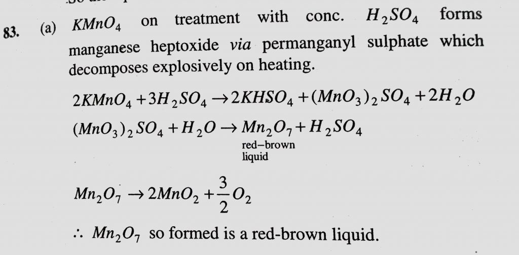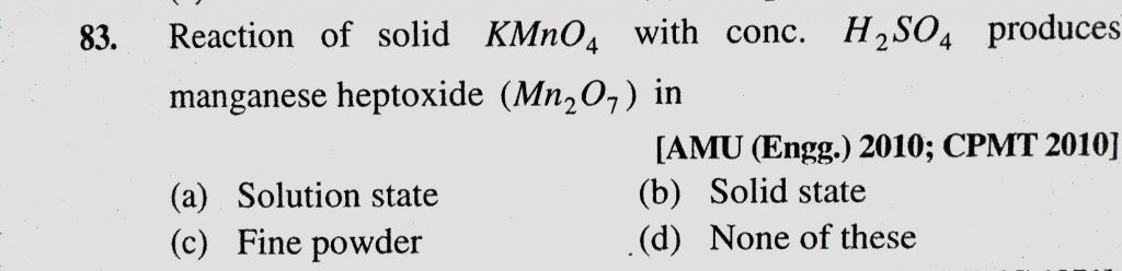 Reaction of solid KMnO4 with conc. H2SO4 produces manganese heptoxide (Mn2O) in (a) Solution state (b) Solid state (c) Fine powder Reaction of solid KMnO4 with conc. H2SO4 produces manganese heptoxide (Mn2O) in (a) Solution state (b) Solid state (c) Fine powder December 1, 2020 Category: Uncategorised (JEE Advanced Physics by BM Sharma + GMP Solutions) , Facebook Messenger WhatsApp Share this:TwitterFacebook Related