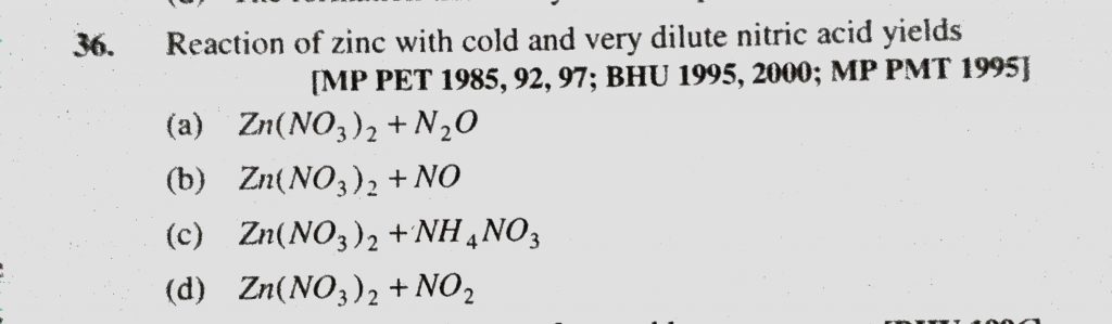 Reaction of zinc with cold and very dilute nitric acid yields (a) Zn(NO3)2 + N2O (b) Zn(NO3)2 + NO Reaction of zinc with cold and very dilute nitric acid yields (a) Zn(NO3)2 + N2O (b) Zn(NO3)2 + NO December 1, 2020 Category: Uncategorised (JEE Advanced Physics by BM Sharma + GMP Solutions) , Facebook Messenger WhatsApp Share this:TwitterFacebook Related