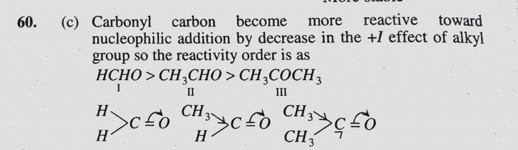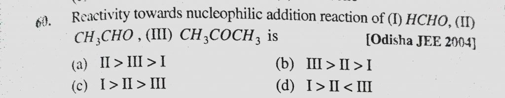 Reactivity towards nucleophilic addition reaction of (I) HCHO, (II) CH3CHO, (III) CH3COCH3 is (II) CH3CHO (III) CH3COCH3 is Reactivity towards nucleophilic addition reaction of (I) HCHO December 9, 2020 Category: Uncategorised (JEE Advanced Physics by BM Sharma + GMP Solutions) , Facebook Messenger WhatsApp Share this:TwitterFacebook Related
