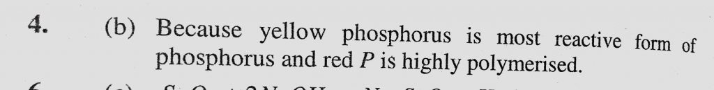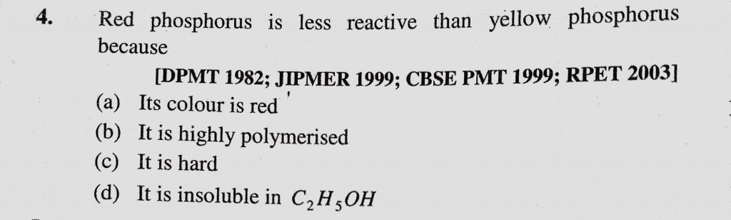 Red phosphorus is less reactive than yellow phosphorus because (a) Its colour is red (b) It is highly polymerised Red phosphorus is less reactive than yellow phosphorus because (a) Its colour is red (b) It is highly polymerised November 25, 2020 Category: Uncategorised (JEE Advanced Physics by BM Sharma + GMP Solutions) , Facebook Messenger WhatsApp Share this:TwitterFacebook Related