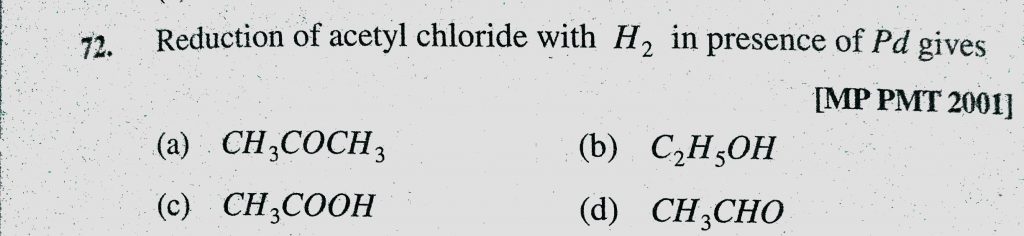 Reduction of acetyl chloride with H2 in presence of Pd gives (a) CH3COCH3 (b) C2H5OH (c) CH3COOH (d) CH3CHO Reduction of acetyl chloride with H2 in presence of Pd gives (a) CH3COCH3 (b) C2H5OH (c) CH3COOH (d) CH3CHO February 8, 2021 Category: Uncategorised (JEE Advanced Physics by BM Sharma + GMP Solutions) , Facebook Messenger WhatsApp Share this:TwitterFacebook Related