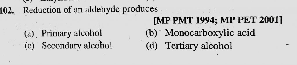 Reduction of an aldehyde produces (a) Primary alcohol (b) Monocarboxylic acid (c) Secondary alcohol (d) Tertiary alcohol Reduction of an aldehyde produces (a) Primary alcohol (b) Monocarboxylic acid (c) Secondary alcohol (d) Tertiary alcohol February 12, 2021 Category: Uncategorised (JEE Advanced Physics by BM Sharma + GMP Solutions) , Facebook Messenger WhatsApp Share this:TwitterFacebook Related