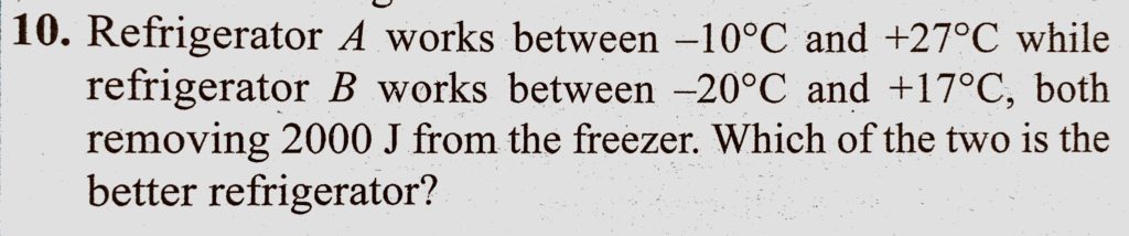 Refrigerator A works between -10 C and + 27 C while refrigerator B works between -20 C and +17 C, both removing 2000 J from the freezer. Which of the two is the better refrigerator? both removing 2000 J from the freezer. Which of the two is the better refrigerator? Refrigerator A works between -10 C and + 27 C while refrigerator B works between -20 C and +17 C October 28, 2020 Category: Uncategorised (JEE Advanced Physics by BM Sharma + GMP Solutions) , Facebook Messenger WhatsApp Share this:TwitterFacebook Related