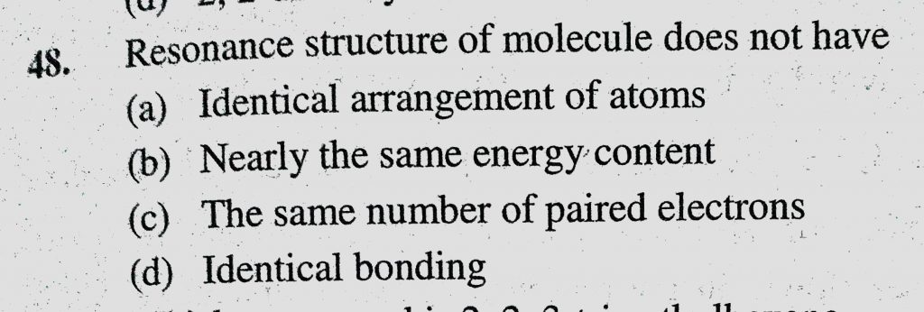 Resonance structure of molecule does not have (a) Identical arrangement of atoms (b) Nearly the same energy content Resonance structure of molecule does not have (a) Identical arrangement of atoms (b) Nearly the same energy content December 11, 2020 Category: Uncategorised (JEE Advanced Physics by BM Sharma + GMP Solutions) , Facebook Messenger WhatsApp Share this:TwitterFacebook Related
