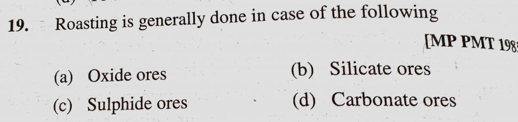 Roasting is generally done in case of the following (a) Oxides ores (b) Silicate ores (c) Sulphide ores (d) Carbonate ores Roasting is generally done in case of the following (a) Oxides ores (b) Silicate ores (c) Sulphide ores (d) Carbonate ores November 11, 2020 Category: Uncategorised (JEE Advanced Physics by BM Sharma + GMP Solutions) , Facebook Messenger WhatsApp Share this:TwitterFacebook Related