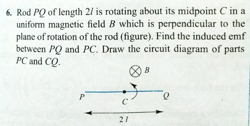 Rod PQ of length 2l is rotating about its midpoint C in a uniform magnetic field B which is perpendicular to the plane of rotation of the rod . Find the induced emf between PQ and PC. Draw the circuit diagram of parts PC and CQ. Figure shows a rectangular loop moving in a uniform magnetic field. Show the electrical equivalence of each branch. what is the net induced emf ? October 19, 2020 Category: Uncategorised (JEE Advanced Physics by BM Sharma + GMP Solutions) , Facebook Messenger WhatsApp Share this:TwitterFacebook Related