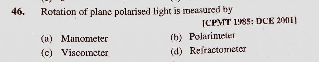 Rotation of plane polarised light is measured by (a) Manometer (b) Polarimeter (c) Viscometer (d) Refractometer Rotation of plane polarised light is measured by (a) Manometer (b) Polarimeter (c) Viscometer (d) Refractometer December 10, 2020 Category: Uncategorised (JEE Advanced Physics by BM Sharma + GMP Solutions) , Facebook Messenger WhatsApp Share this:TwitterFacebook Related
