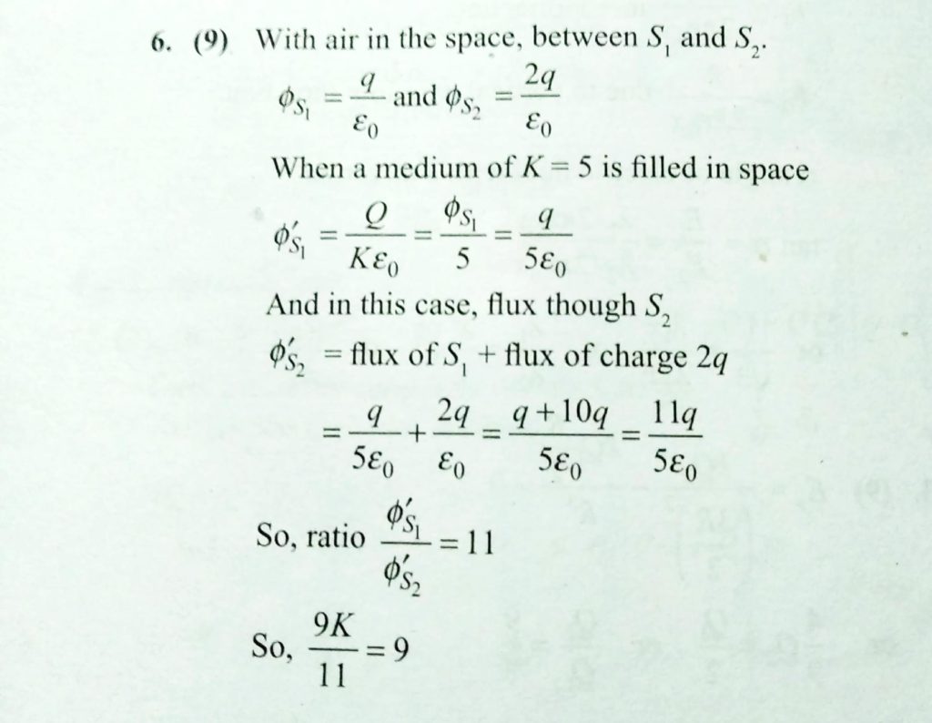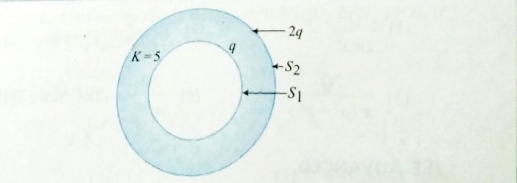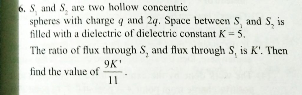 S1 and S2 are two hollow concentric spheres with charge q and 2q . space between s1 and s2 is filled with a dielectric of dielectric constant K = 5 . The ratio of flux through s2 and flux through s1 is K’ . Then find the value of 9K’/11. The electric field in a region is radially outward with magnitude E = ar. If a = 100 V/m^2 and R = 0.30 m then the value of charge contained in a sphere of radius R centred at the origin is W × 10^−10 C. Find W. November 1, 2020 Category: Uncategorised (JEE Advanced Physics by BM Sharma + GMP Solutions) , Facebook Messenger WhatsApp Share this:TwitterFacebook Related