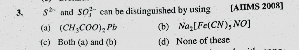 S2- and SO3 2- can be distinguished by using (a) (CH3COO)2 Pb (b) Na2(Fe(CN)5NO) S2- and SO3 2- can be distinguished by using (a) (CH3COO)2 Pb (b) Na2(Fe(CN)5NO) December 6, 2020 Category: Uncategorised (JEE Advanced Physics by BM Sharma + GMP Solutions) , Facebook Messenger WhatsApp Share this:TwitterFacebook Related