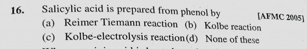 Salicylic acid is prepared from phenol by (a) Reimer Tiemann reaction (b) Kolbe reaction (c) Kolbe-electrolysis reaction (d) None of these Salicylic acid is prepared from phenol by (a) Reimer Tiemann reaction (b) Kolbe reaction (c) Kolbe-electrolysis reaction (d) None of these February 13, 2021 Category: Uncategorised (JEE Advanced Physics by BM Sharma + GMP Solutions) , Facebook Messenger WhatsApp Share this:TwitterFacebook Related