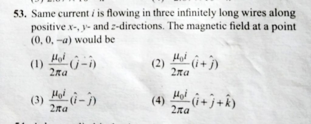Same current i is flowing in three infinitely long wire along positive x-, y- and z- directions. The magnetic field at a point ( 0, 0, -a ) would be -a ) would be Same current i is flowing in three infinitely long wire along positive x- y- and z- directions. The magnetic field at a point ( 0 October 17, 2020 Category: Uncategorised (JEE Advanced Physics by BM Sharma + GMP Solutions) , Facebook Messenger WhatsApp Share this:TwitterFacebook Related