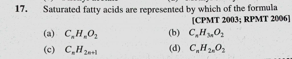 Saturated fatty acid are represented by which of the formula (a) CnHnO2 (b) CnH3nO2 (c) CnH2n+1 (d) CnH2nO2 Saturated fatty acid are represented by which of the formula (a) CnHnO2 (b) CnH3nO2 (c) CnH2n+1 (d) CnH2nO2 February 12, 2021 Category: Uncategorised (JEE Advanced Physics by BM Sharma + GMP Solutions) , Facebook Messenger WhatsApp Share this:TwitterFacebook Related