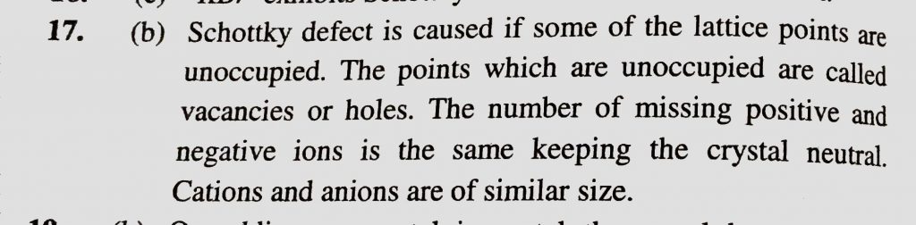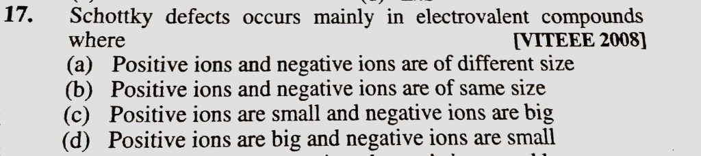 Schootky defects occurs mainly in electrovalent compounds where (a) Positive ions and negative ions are of different size (b) Positive ions and negative ions are of same size Schootky defects occurs mainly in electrovalent compounds where (a) Positive ions and negative ions are of different size (b) Positive ions and negative ions are of same size December 17, 2020 Category: Uncategorised (JEE Advanced Physics by BM Sharma + GMP Solutions) , Facebook Messenger WhatsApp Share this:TwitterFacebook Related
