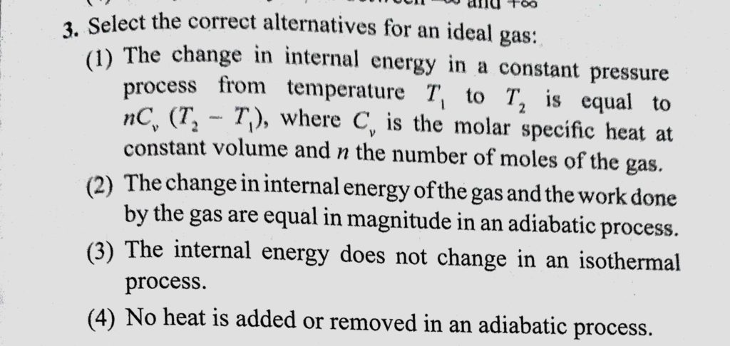 Select the correct alternatives for a ideal gas: (1) The change in internal energy in a constant pressure process from temperature T1 to T2 is equal to nCv (T2 – T1), where Cv Select the correct alternatives for a ideal gas: (1) The change in internal energy in a constant pressure process from temperature T1 to T2 is equal to nCv (T2 - T1) where Cv October 29, 2020 Category: Uncategorised (JEE Advanced Physics by BM Sharma + GMP Solutions) , Facebook Messenger WhatsApp Share this:TwitterFacebook Related