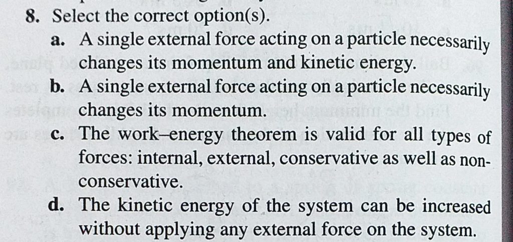 Select the correct option(s). a. A single external force acting on a particle necessarily changes its momentum and kinetic energy. b. A single external force acting on a particle necessarily changes Select the correct option(s). a. A single external force acting on a particle necessarily changes its momentum and kinetic energy. b. A single external force acting on a particle necessarily changes October 4, 2020 Category: Uncategorised (JEE Advanced Physics by BM Sharma + GMP Solutions) , Facebook Messenger WhatsApp Share this:TwitterFacebook Related