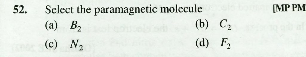 Select the paramagnetic molecule (a) B2 (b) C2 (c) N2 (d) F2 Select the paramagnetic molecule (a) B2 (b) C2 (c) N2 (d) F2 December 8, 2020 Category: Uncategorised (JEE Advanced Physics by BM Sharma + GMP Solutions) , Facebook Messenger WhatsApp Share this:TwitterFacebook Related