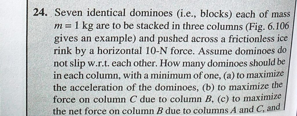 Seven identical dominoes (i.e., blocks) each of mass m = 1 kg are to be stacked in three columns. (Fig. 6.106 gives as example) and pushed across a frictionless ice rink by a horizontal 10 N force. Assume dominoes do not slip blocks) each of mass m = 1 kg are to be stacked in three columns. (Fig. 6.106 gives as example) and pushed across a frictionless ice rink by a horizontal 10 N force. Assume dominoes do not slip Seven identical dominoes (i.e. September 25, 2020 Category: Uncategorised (JEE Advanced Physics by BM Sharma + GMP Solutions) , Facebook Messenger WhatsApp Share this:TwitterFacebook Related