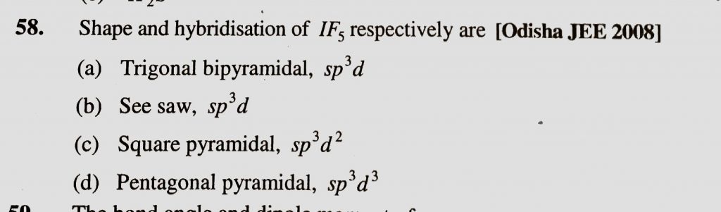 Shape and hybridisation of IF5 respectively are (a) Trigonal bipyramidal , sp^3d (b) see saw , sp^3d (c) square pyramidal , sp^3d^2 (d) pentagonal pyramidal , sp^3d^3 Shape and hybridisation of IF5 respectively are (a) Trigonal bipyramidal sp^3d (b) see saw sp^3d (c) square pyramidal sp^3d^2 (d) pentagonal pyramidal sp^3d^3 December 7, 2020 Category: Uncategorised (JEE Advanced Physics by BM Sharma + GMP Solutions) , Facebook Messenger WhatsApp Share this:TwitterFacebook Related