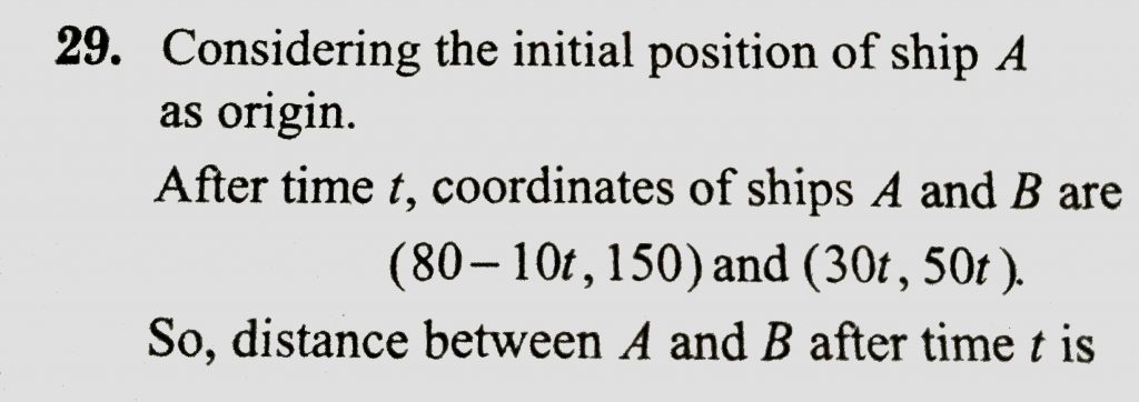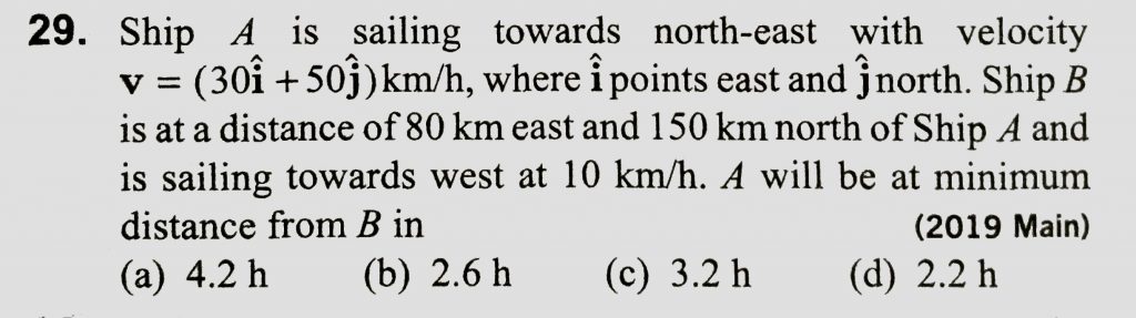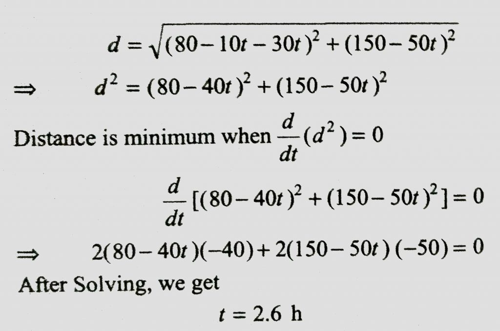 Ship A is sailing towards north-east with velocity v =30 i^+50 j^km/hr where i^points east and j^, north. Ship B is at a distance of 80 km east and 150 km north of Ship A and is sailing towards west at 10 km/hr. A will be at minimum distance from B in