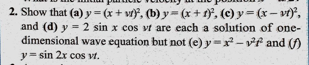 Show that (a) y = (x + vt)^2, (x + t)^2, (c) y = (x – vt)^2, and (d) y = 2 sin x cos vt are each a solution of one-dimensional wave equation but not (e) y = x^2 -v^2t^2 and (f) y = sin 2x cos vt. (c) y = (x - vt)^2 (x + t)^2 and (d) y = 2 sin x cos vt are each a solution of one-dimensional wave equation but not (e) y = x^2 -v^2t^2 and (f) y = sin 2x cos vt. Show that (a) y = (x + vt)^2 November 1, 2020 Category: Uncategorised (JEE Advanced Physics by BM Sharma + GMP Solutions) , Facebook Messenger WhatsApp Share this:TwitterFacebook Related