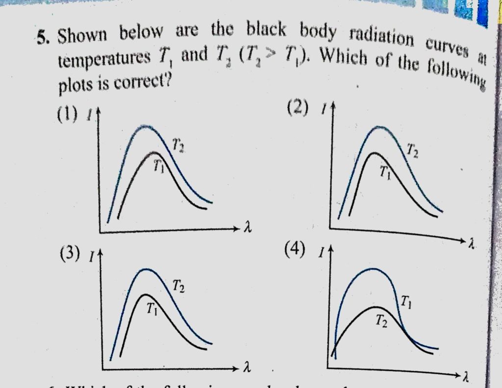 Shown below are the black body radiation curves at temperatures T1 and T2 (T2 > T1). Which of the following plots is correct ? Shown below are the black body radiation curves at temperatures T1 and T2 (T2 > T1). Which of the following plots is correct ? October 25, 2020 Category: Uncategorised (JEE Advanced Physics by BM Sharma + GMP Solutions) , Facebook Messenger WhatsApp Share this:TwitterFacebook Related