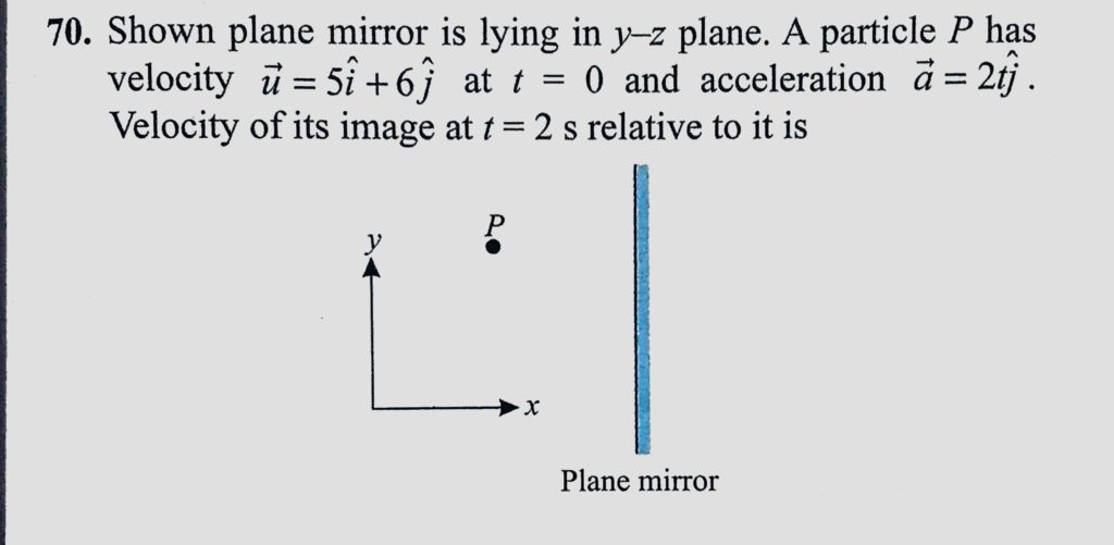 Shown plane mirror is lying in y-z plane. A particle P has velocity u = 5i + 6j at t = 0 and acceleration a = 2tj. Velocity of its image at t = 2 s relative to it is Shown plane mirror is lying in y-z plane. A particle P has velocity u = 5i + 6j at t = 0 and acceleration a = 2tj. Velocity of its image at t = 2 s relative to it is October 6, 2020 Category: Uncategorised (JEE Advanced Physics by BM Sharma + GMP Solutions) , Facebook Messenger WhatsApp Share this:TwitterFacebook Related