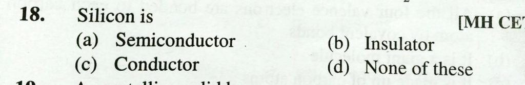 Silicon is (a) Semiconductor (b) Insulator (c) Conductor (d) None of these Silicon is (a) Semiconductor (b) Insulator (c) Conductor (d) None of these February 8, 2021 Category: Uncategorised (JEE Advanced Physics by BM Sharma + GMP Solutions) , Facebook Messenger WhatsApp Share this:TwitterFacebook Related
