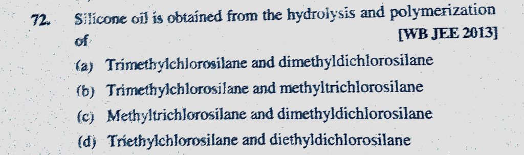 Silicone oil is obtained from the hydrolysis and polymerization of (a) Trimethylchlorosilane and dimethyldichlorosilane (c) Trimethylchlorosilane and methyltricholorosilane Silicone oil is obtained from the hydrolysis and polymerization of (a) Trimethylchlorosilane and dimethyldichlorosilane (c) Trimethylchlorosilane and methyltricholorosilane November 17, 2020 Category: Uncategorised (JEE Advanced Physics by BM Sharma + GMP Solutions) , Facebook Messenger WhatsApp Share this:TwitterFacebook Related
