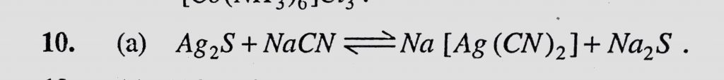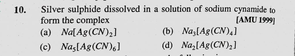 Silver sulphide dissolved in a solution of sodium cynamide to form the complex (a) Na(Ag(CN)2) (b) Na3(Ag(CN)4) Silver sulphide dissolved in a solution of sodium cynamide to form the complex (a) Na(Ag(CN)2) (b) Na3(Ag(CN)4) December 5, 2020 Category: Uncategorised (JEE Advanced Physics by BM Sharma + GMP Solutions) , Facebook Messenger WhatsApp Share this:TwitterFacebook Related