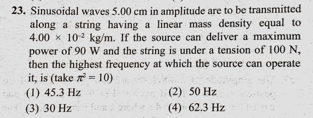 Sinusoidal waves 5.00 cm in amplitude are to be transmitted along a string having a linear mass density equal to 4.00 * 10^-2 kg/m. If the source can deliver a maximum power Sinusoidal waves 5.00 cm in amplitude are to be transmitted along a string having a linear mass density equal to 4.00 * 10^-2 kg/m. If the source can deliver a maximum power November 1, 2020 Category: Uncategorised (JEE Advanced Physics by BM Sharma + GMP Solutions) , Facebook Messenger WhatsApp Share this:TwitterFacebook Related