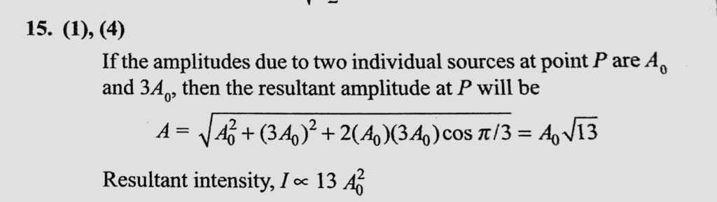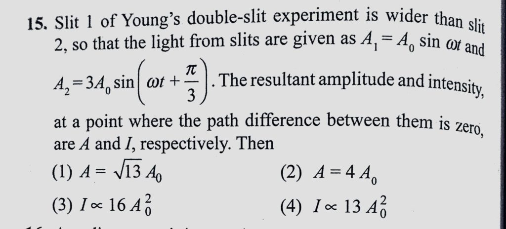 Slit 1 of Young’s double-slit experiment is wider than slit 2, so that the light from slits are given as A1 = A0 sin omega t and A2 = 3 A0 sin ( omega t + pie / 3). The resultant amplitude and intensity, Slit 1 of Young's double-slit experiment is wider than slit 2 so that the light from slits are given as A1 = A0 sin omega t and A2 = 3 A0 sin ( omega t + pie / 3). The resultant amplitude and intensity October 11, 2020 Category: Uncategorised (JEE Advanced Physics by BM Sharma + GMP Solutions) , Facebook Messenger WhatsApp Share this:TwitterFacebook Related