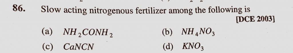 Slow acting nitrogenous fertilizer among the following is (a) NH2CONH2 (b) NH4NO3 (c) CaNCN (d) KNO3 Slow acting nitrogenous fertilizer among the following is (a) NH2CONH2 (b) NH4NO3 (c) CaNCN (d) KNO3 November 17, 2020 Category: Uncategorised (JEE Advanced Physics by BM Sharma + GMP Solutions) , Facebook Messenger WhatsApp Share this:TwitterFacebook Related
