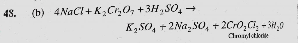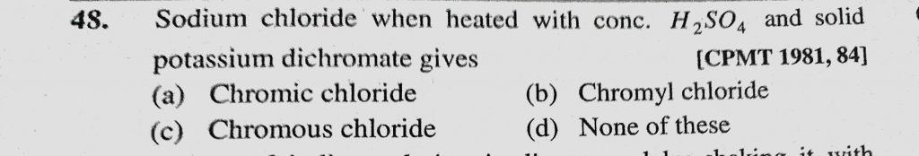 Sodium chloride when heated with conc. H2SO4 and solid potassium dichromate gives (a) Chromic chloride (b) Chromyl chloride (c) Chromous chloride (d) None of these Sodium chloride when heated with conc. H2SO4 and solid potassium dichromate gives (a) Chromic chloride (b) Chromyl chloride (c) Chromous chloride (d) None of these November 24, 2020 Category: Uncategorised (JEE Advanced Physics by BM Sharma + GMP Solutions) , Facebook Messenger WhatsApp Share this:TwitterFacebook Related