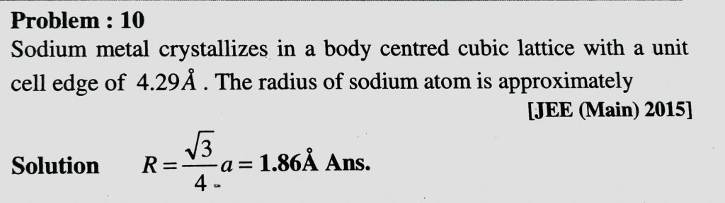 Sodium metal crystallizes in body Centedrd cubic lattice with a unit cell edge of 4.29 A. The radius of sodium atom is approximately Sodium metal crystallizes in body Centedrd cubic lattice with a unit cell edge of 4.29 A. The radius of sodium atom is approximately February 10, 2021 Category: Uncategorised (JEE Advanced Physics by BM Sharma + GMP Solutions) , Facebook Messenger WhatsApp Share this:TwitterFacebook Related