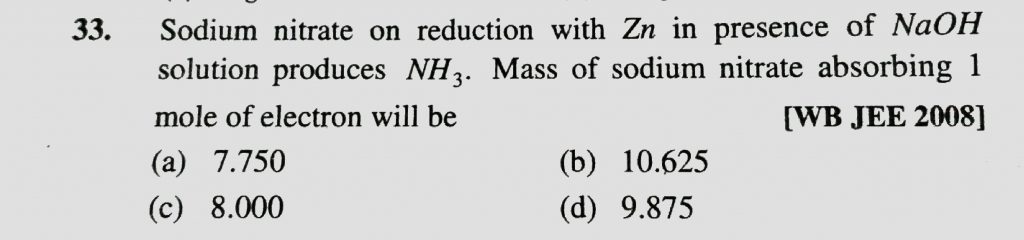 Sodium nitrate on reduction with Zn in presence of NaOH solution produces NH3. Mass of sodium nitrate absorbing 1 mole of electron will be Sodium nitrate on reduction with Zn in presence of NaOH solution produces NH3. Mass of sodium nitrate absorbing 1 mole of electron will be November 22, 2020 Category: Uncategorised (JEE Advanced Physics by BM Sharma + GMP Solutions) , Facebook Messenger WhatsApp Share this:TwitterFacebook Related