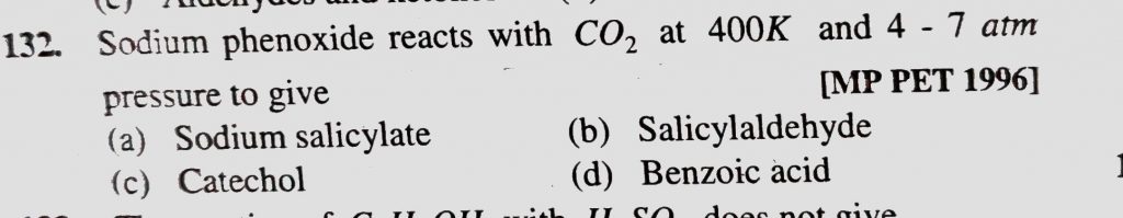 Sodium phenoxide reacts with CO2 at 400 K and 4-7 atm pressure to give (a) Sodium salicylate (b) Salicylaldehyde (c) Catechol (d) Benzoic acid Sodium phenoxide reacts with CO2 at 400 K and 4-7 atm pressure to give (a) Sodium salicylate (b) Salicylaldehyde (c) Catechol (d) Benzoic acid February 14, 2021 Category: Uncategorised (JEE Advanced Physics by BM Sharma + GMP Solutions) , Facebook Messenger WhatsApp Share this:TwitterFacebook Related