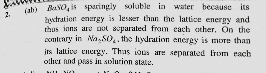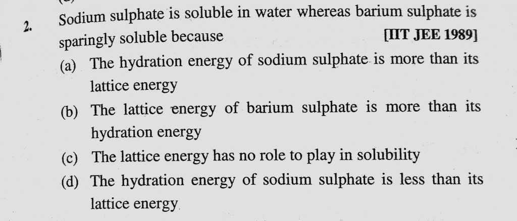 Sodium sulphate is soluble in water whereas barium sulplhate is sparingly soluble because (a) The hydration energy of sodium sulphate is more than its lattice energy Sodium sulphate is soluble in water whereas barium sulplhate is sparingly soluble because (a) The hydration energy of sodium sulphate is more than its lattice energy November 28, 2020 Category: Uncategorised (JEE Advanced Physics by BM Sharma + GMP Solutions) , Facebook Messenger WhatsApp Share this:TwitterFacebook Related
