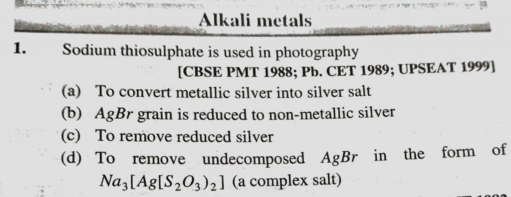 Sodium thiosulphate is used in photography (a) to convert metallic silver into silver salt (b) AgBr grain is reduced to non-metallic silver Sodium thiosulphate is used in photography (a) to convert metallic silver into silver salt (b) AgBr grain is reduced to non-metallic silver November 13, 2020 Category: Uncategorised (JEE Advanced Physics by BM Sharma + GMP Solutions) , Facebook Messenger WhatsApp Share this:TwitterFacebook Related